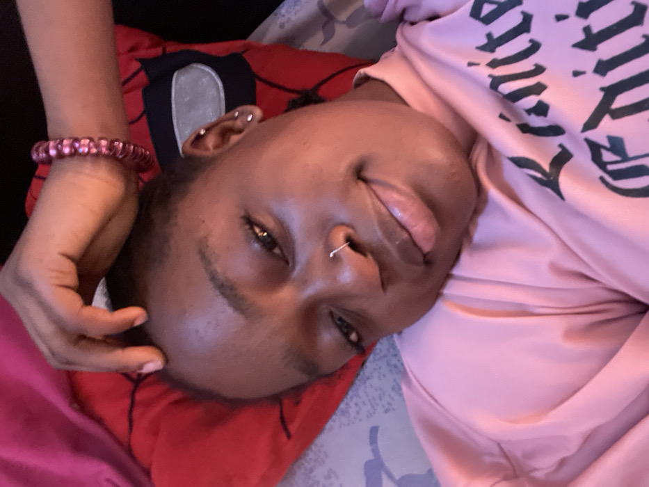 One individual is depicted in a close-up, upward-angled shot. The person has dark skin, with their head tilted slightly to the left. A small silver-colored ring or stud is visible in the left nostril. Multiple silver-colored studs are present in the helix and lobe of the visible right ear. The individual wears a pink long-sleeved garment featuring dark lettering on the chest, partially obscuring the phrase "Limited Edition." One hand, adorned with a pink coiled hair tie or bracelet on the wrist, rests on the person's forehead. The individual is positioned against a red pillow that displays a partial black graphic resembling a spider emblem. Behind the pillow, a light-colored, patterned textile is visible. The lighting is warm and indirect. The exact location within the city of Ado, Nigeria cannot be determined from the visual evidence provided.