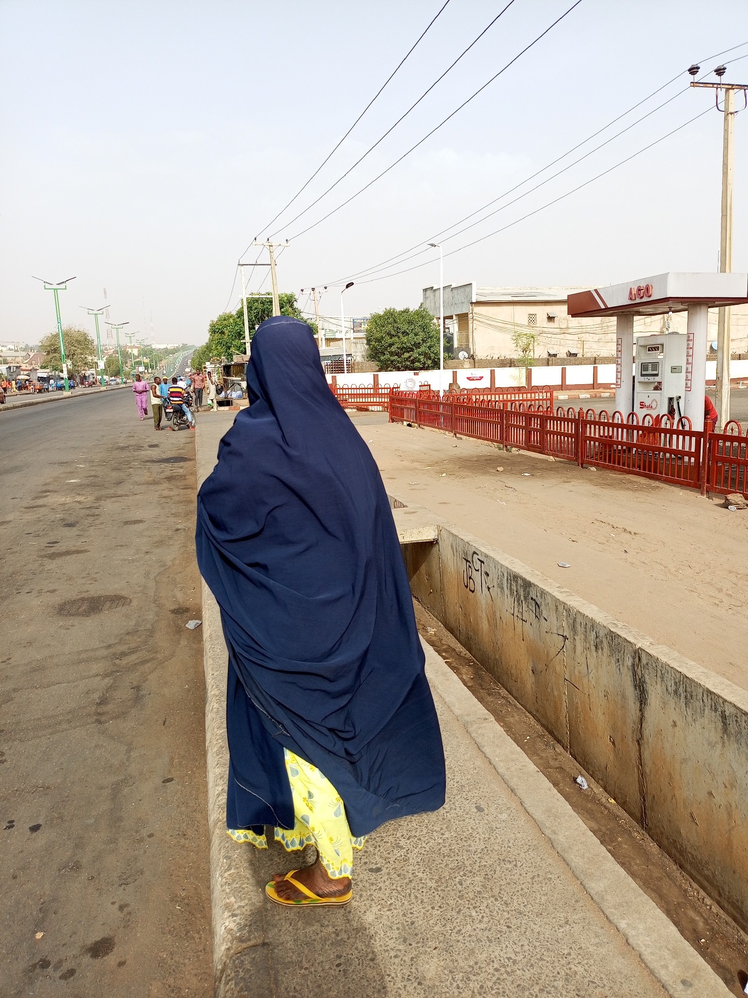 - "An overhead view captures a person from behind, standing on a concrete curb, looking down a multi-lane asphalt road in Gombe, Nigeria" by FM-l9iEo2, licensed under CC BY 4.0