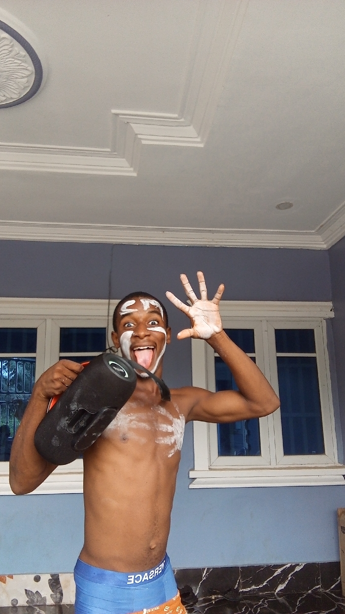 The image depicts an indoor scene in Agburu Uke, Nigeria. A young, bare-chested male with dark skin stands centered, facing the camera. He wears blue underwear with a white waistband displaying "VERSACE" text in reverse. White powdery substance is applied to his face in patterns around his eyes, above his eyebrows, down his nose, and on his chin. His left hand holds a black, cylindrical portable speaker with a carrying strap. His right hand is raised, fingers splayed, and coated in the white substance, which is also visible on his chest and right arm. His facial expression is wide-eyed with his mouth open and tongue extended. The background features a medium blue-grey wall with two white-framed windows containing blue-tinted glass. Above, a white ceiling displays decorative molding, including a corner piece and a circular ornate medallion with a blue-grey rim in the upper left, and a recessed light fixture in the upper right. The floor consists of dark, glossy tiles with white veining.