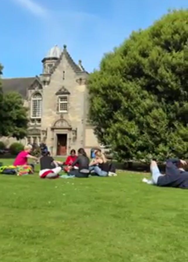 Here is a detailed description of the video: The video shows a group of people sitting and lying on a large lawn in front of a grand, historic building under a clear, blue sky. The building features a dome, arched windows, and a stone facade. Lush green trees frame the scene, adding to the picturesque setting. A group of people are sitting in a circle on the grass. One person is sitting apart from the group, lying on their back near a large, leafy tree. People appear to be relaxing and socializing. There is a casual and peaceful atmosphere. The scene seems to be taking place on a university campus or in a similar public park.