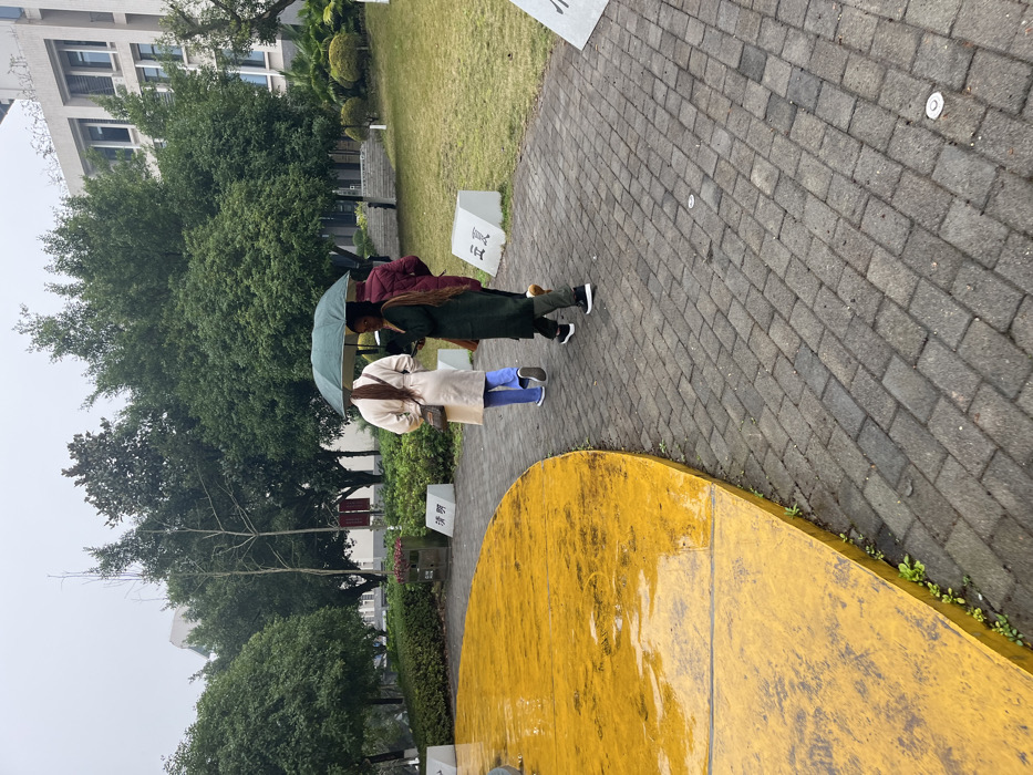 Three individuals walk along a paved path under umbrellas on a cloudy day. The person closest is wearing a light-colored coat, blue jeans, and gray shoes. The second individual is wearing a green coat, and the third has on a maroon coat. The path is surrounded by green trees and grass, with a yellow semi-circular object on the right. Buildings are visible in the background.