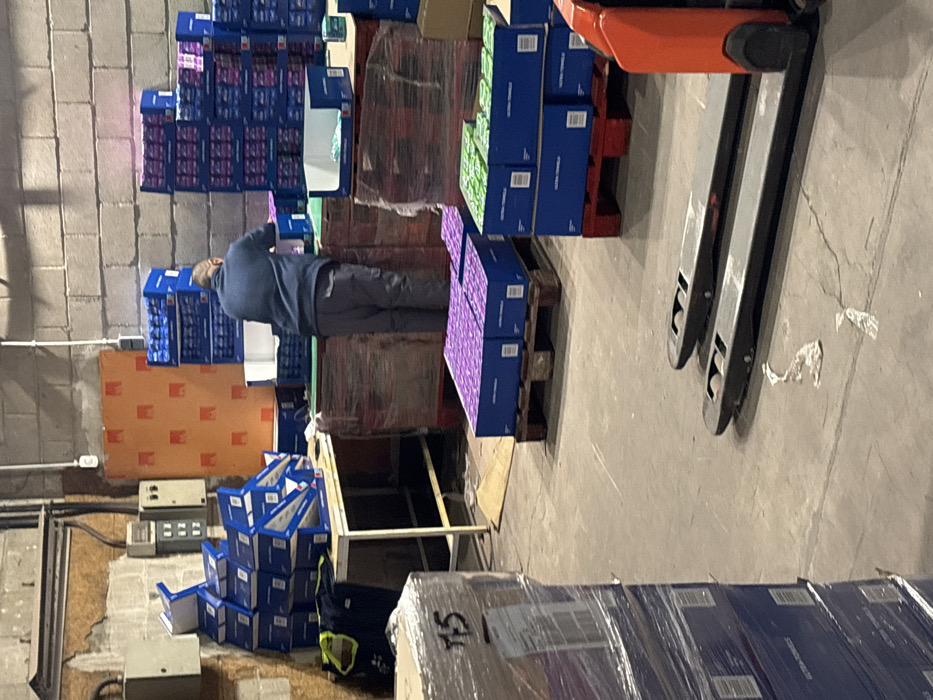 The scene depicts an interior view of an industrial warehouse in Polígono Industrial Nicomedes García, Spain. The environment consists of concrete block walls, a light grey concrete floor, and visible electrical conduits and utility boxes mounted on the wall to the left. Overhead lighting, not directly visible, illuminates the space. One adult male, observed from behind, stands near the center-right of the image. He wears a dark blue long-sleeved shirt and grey cargo pants. His posture indicates he is actively engaged in handling goods. Numerous blue cardboard boxes are prominent throughout the scene. To the left, a metal-framed table with a white top supports stacks of these boxes, some with open tops. A yellow-green high-visibility garment and a dark bag hang from the table's side. Behind and to the right of the worker, tall stacks of shrink-wrapped blue boxes containing what appear to be purple-packaged items are visible on wooden pallets. More open blue boxes are on top of these stacks, some containing green-packaged items. On the concrete floor in the foreground, two wooden pallets hold stacks of blue boxes with purple contents, shrink-wrapped. To their right, another wooden pallet, partially red, supports additional blue boxes, some containing green-packaged items. A large, shrink-wrapped pallet with the number "115" handwritten on it is positioned in the far left foreground. The forks of an orange and black pallet jack or forklift are visible in the lower right corner, extending onto the concrete floor. Small pieces of white debris are scattered on the floor.