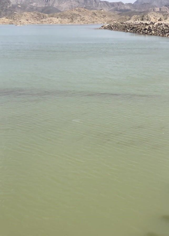 dam with water flowing over its edge. Several men dressed in traditional Pakistani clothing, including turbans and shalwar kameez, are carefully walking across the top of the dam. The landscape features a reservoir of greenish water, a rugged rocky shoreline, and distant mountains under a hazy sky.