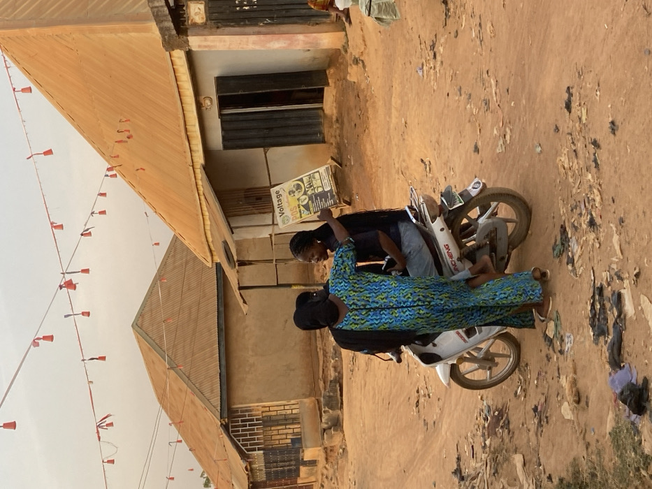 Two individuals are positioned on a white motorcycle against a backdrop of buildings with rusted roofs. One person, clad in a blue and green patterned garment and a black head covering, sits on the back of the motorcycle. The second person, dressed in dark clothing, faces them while holding a sign. The ground surrounding the motorcycle is dirt with scattered debris. Overhead, strings of orange decorations are strung between buildings.