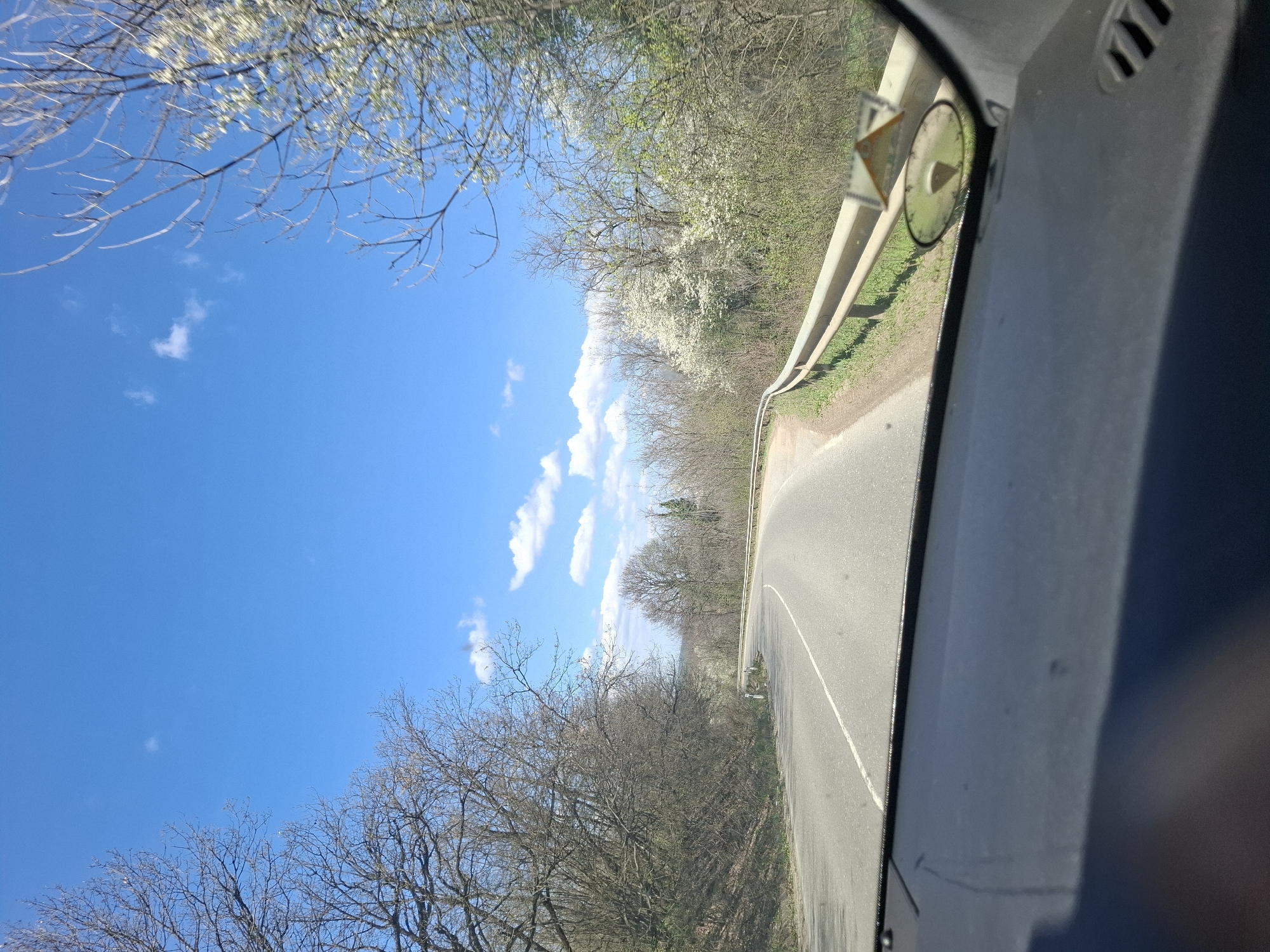 view from inside a vehicle driving on a road near the city of Smirnenski, Bulgaria. The road is asphalt with a white line marking, with a guardrail on the right side. Trees line both sides of the road, some with white blossoms. The sky is bright blue with scattered white clouds. The dashboard and side of the vehicle are visible in the foreground. There are no people visible in the scene. The environment appears to be a rural area on a sunny day.