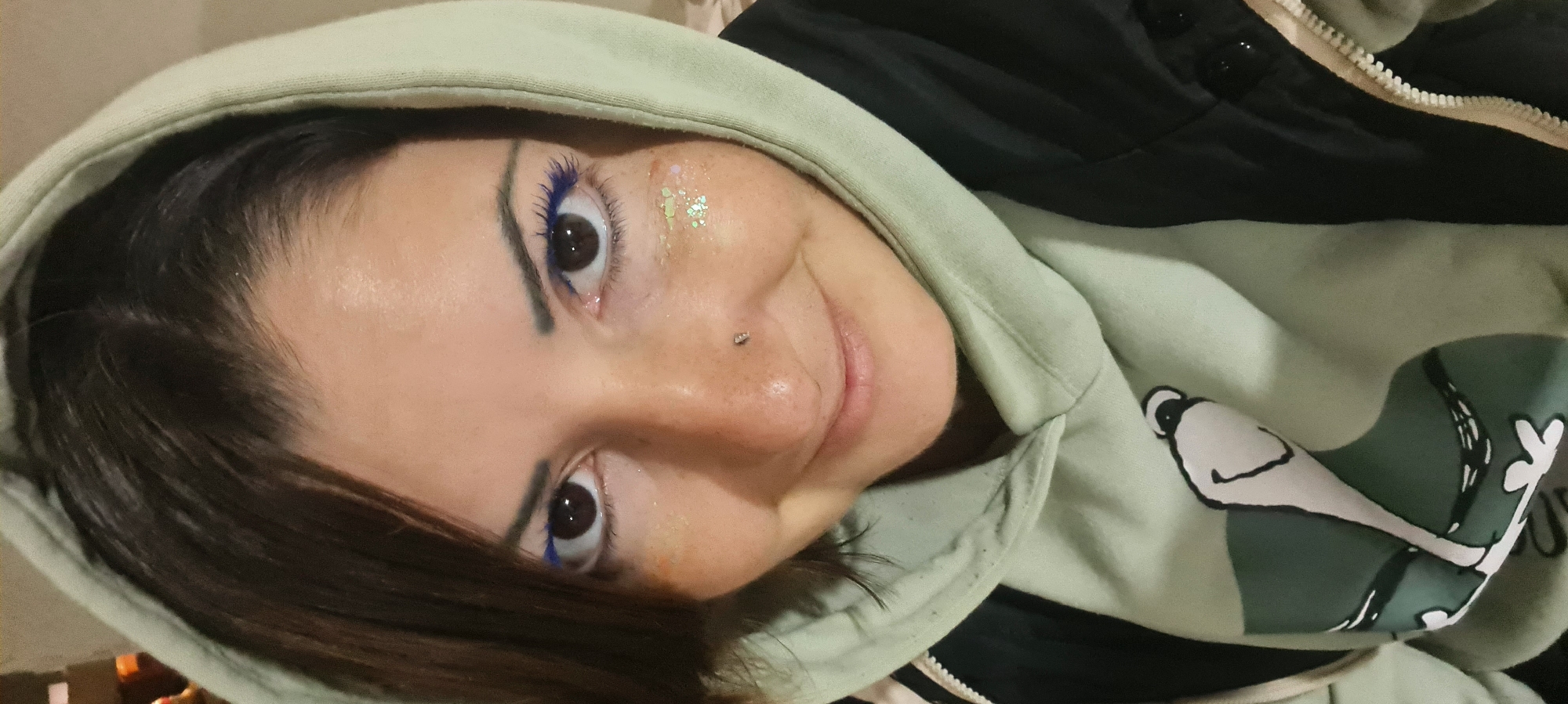 A person is seen close up, wearing a light green hoodie pulled up over their head. The person has brown hair, brown eyes, and fair skin. Blue eyeliner is visible on the lower eyelids, and iridescent glitter is on the upper cheekbone. A nose piercing is present. The person is smiling slightly. The image is rotated counterclockwise. There is no indication of the location being Nahariyya, Israel.