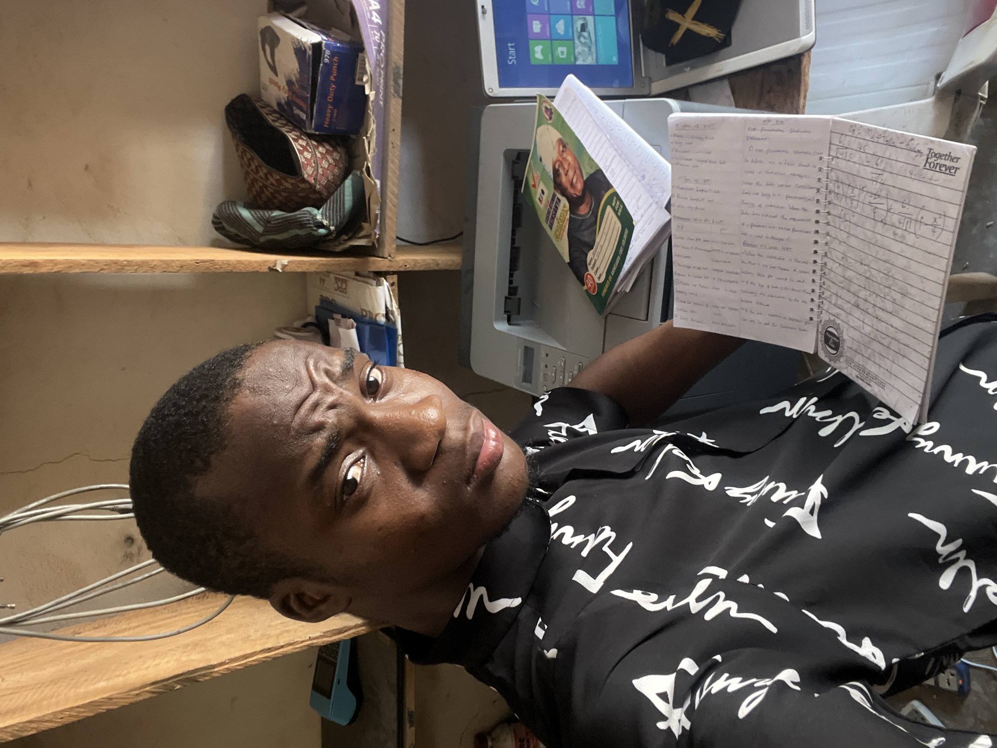 A man is indoors, holding open a notebook with handwritten notes. He is positioned in what appears to be a cluttered room. Behind him are shelves with various items, including a blue box, a woven basket, and loose cables. A printer and a laptop running Windows are nearby. The notebook in his hand has the phrase "Together Forever" printed on the top right corner of one page. The man is wearing a black shirt with white cursive writing. His facial expression suggests a thoughtful or contemplative mood. The location is identified as Minna, Nigeria.