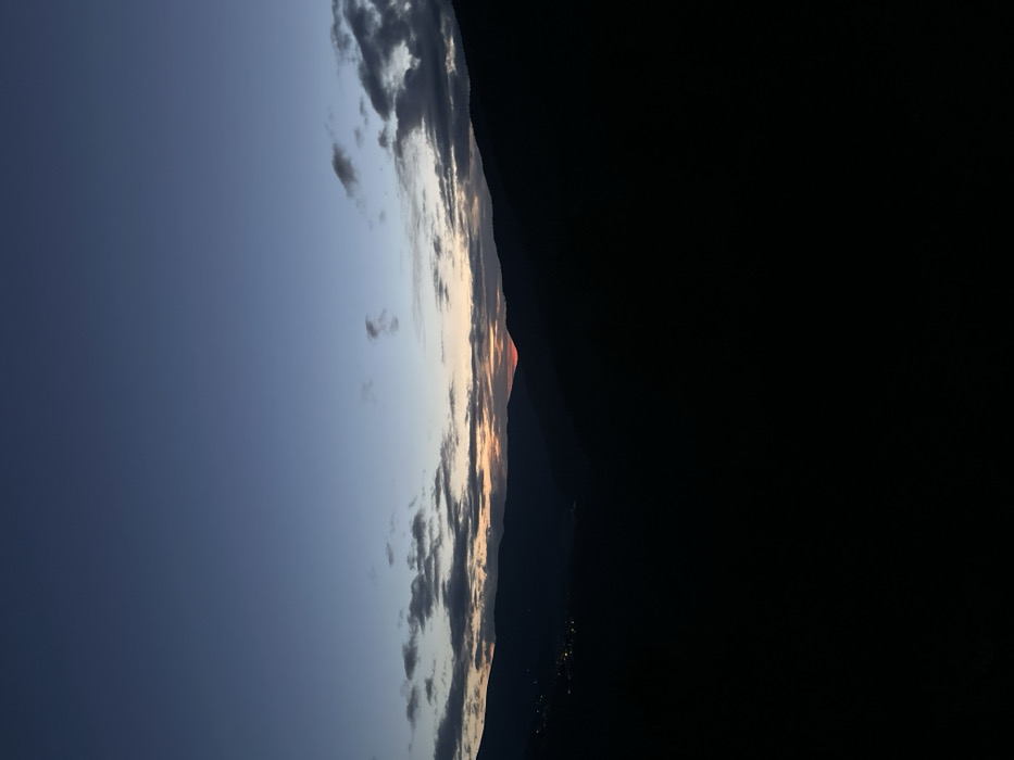 An image captures a twilight scene with a dark mountain ridge dominating the right side. A vibrant sky with clouds and a warm glow spans the left side, transitioning from blue to sunset hues. Light flickers at the base of the mountain, suggesting distant settlements. The photo is vertically oriented, emphasizing the sky and mountain juxtaposition.