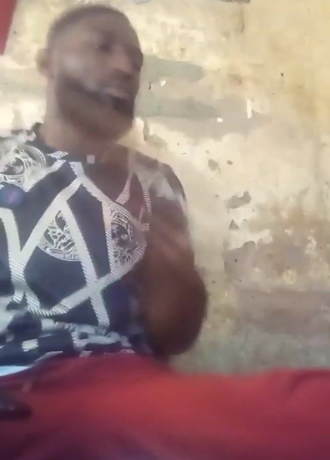 A bearded man in a patterned shirt and red pants sits in front of a weathered wall with a small window. He holds a piece of food in his hand and eats it. A metal bowl sits on his lap.