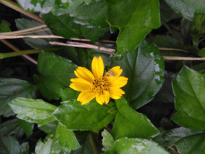 The scene is located in the city of Asse, Belgium. The image presents a close-up, vertical view of a single bright yellow composite flower, positioned slightly above the lower center. The flower possesses approximately ten to twelve distinct, slender petals radiating from a textured, dark yellow-brown central disk. A small, light-colored insect, consistent with a fly or gnat, is observed resting on the upper-right petal of the flower. The flower is surrounded by numerous dark green, ovate leaves, many of which exhibit visible water droplets or a moist sheen on their surfaces, indicating recent precipitation or dew. The background consists of blurred dark green foliage, with several thin, dried-out brown stems visible in the upper-right portion of the frame. No human figures or man-made objects are present.