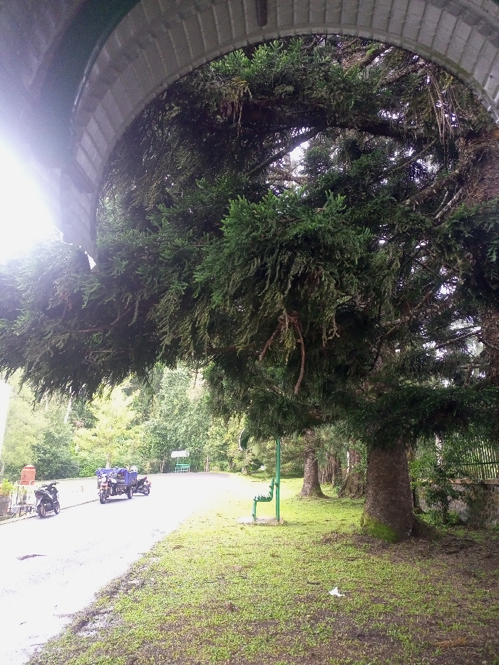 The image presents an outdoor scene in Beni, Nepal, captured from a low perspective. A light-colored, segmented architectural archway frames the upper left portion of the view, with a bright light source causing glare from the top left. A large conifer tree, heavily laden with dark green foliage and visible moss or epiphytes, occupies the central and right areas of the frame. Its thick, dark brown trunk is visible on the lower right, with a row of similar trees extending into the background along a grassy verge. A wet, dark gray paved road curves from the lower left towards the center-right background. On the left side of this road, a dark-colored motorcycle is stationary on its kickstand, followed by a blue three-wheeled motor vehicle, possibly an auto-rickshaw or cargo tricycle, facing away from the viewer. To the immediate right of the road, a patch of green grass mixed with exposed soil contains a vertically installed green metal pipe structure. A grey stone wall topped with a green metal fence is visible behind the row of trees on the far right. The background consists of dense green foliage, with an indistinct light-colored structure visible further down the road. No individuals are present in the depicted scene.