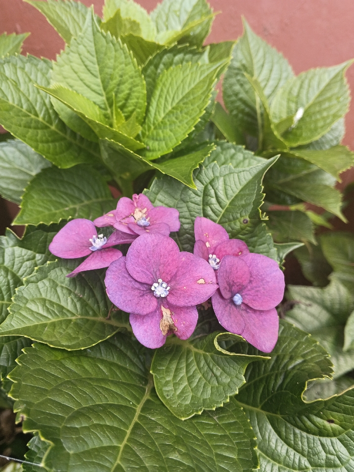 A close-up photograph depicts a flowering plant, identified as a Hydrangea, located in Bien Hoa, Vietnam. The primary subjects are a cluster of approximately six deep magenta florets, each composed of four petals. The florets exhibit light blue to white central reproductive structures. Minor brown discoloration is present on the petals of the largest central floret and one adjacent floret. These flowers are surrounded by numerous vibrant green, ovate leaves with serrated edges and visible venation. Younger, lighter green leaves are visible in the upper portion of the frame. One leaf in the lower right shows minor curling and damage. The background is an indistinct, blurred reddish-brown surface.