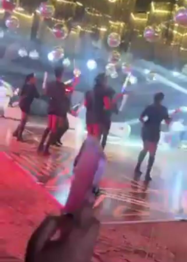 group of dancers in a club performing with light sticks, interspersed with shots of a person recording. The dancers are wearing short black outfits and boots. The club is decorated with disco balls and lights. The person recording has a phone with a decorative case. They dance and film in the nightclub.