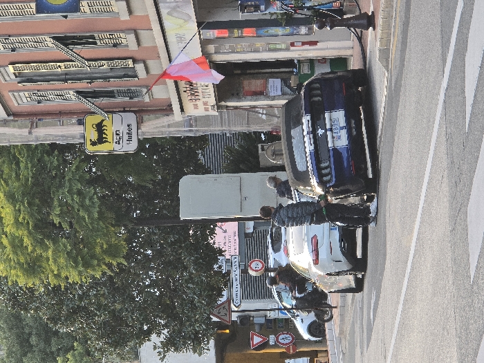 A street scene shows a blue Ford Mustang parked next to a white BMW. People are standing near the cars. A flagpole with a white and red flag is on the building. A gas station sign and several traffic signs are visible on the left side of the frame. A tree with green leaves overhangs the street. The image is slightly rotated, resulting in a distorted perspective.