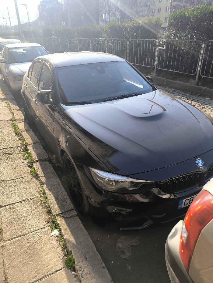 This image depicts an outdoor urban street scene in Sofia, Bulgaria, under bright daylight conditions. A black BMW M series sedan, featuring a prominent hood power bulge, aggressive front fascia, and black multi-spoke wheels, is parked on an unpaved shoulder adjacent to a concrete slab sidewalk. The vehicle displays a Bulgarian license plate with "CB" characters, indicating registration in Sofia. Immediately in front of the black BMW, the rear bumper and red taillight of a light beige/gold vehicle are visible. Partially obscured behind the BMW is a silver sedan. The sidewalk on the left exhibits cracks with sparse green vegetation, bordering a stone curb. The unpaved parking surface directly under the BMW contains a crumpled, light-colored object near the front bumper. In the background, a low metal fence with vertical bars and horizontal railings separates the street area from a dense green hedge. Beyond the hedge, a light-colored multi-story building is visible. The sky is bright with visible sun glare and lens flare originating from the upper left quadrant of the frame. No individuals are visible, and all vehicles appear stationary.