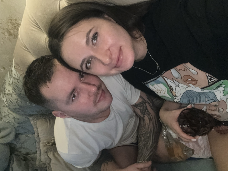 A couple reclines on a patterned couch, close to each other. The woman, with dark hair, wears a graphic black t-shirt and a cross necklace, while holding a decorative, dark-colored object. The man, sporting a white t-shirt, has a close-cropped haircut and facial hair. He is adorned with forearm tattoos. Both are looking towards the camera. The scene is captured from a slightly high angle, emphasizing their relaxed pose.