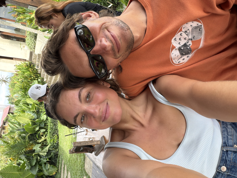 A man with sunglasses and an orange shirt printed with dice poses intimately with a woman in a blue tank top and jeans. They are outside, near a wooden table and lush green plants. Another person with a white baseball cap is visible in the background, along with a woman with auburn hair. The photo appears to be taken from a low angle, possibly a selfie.