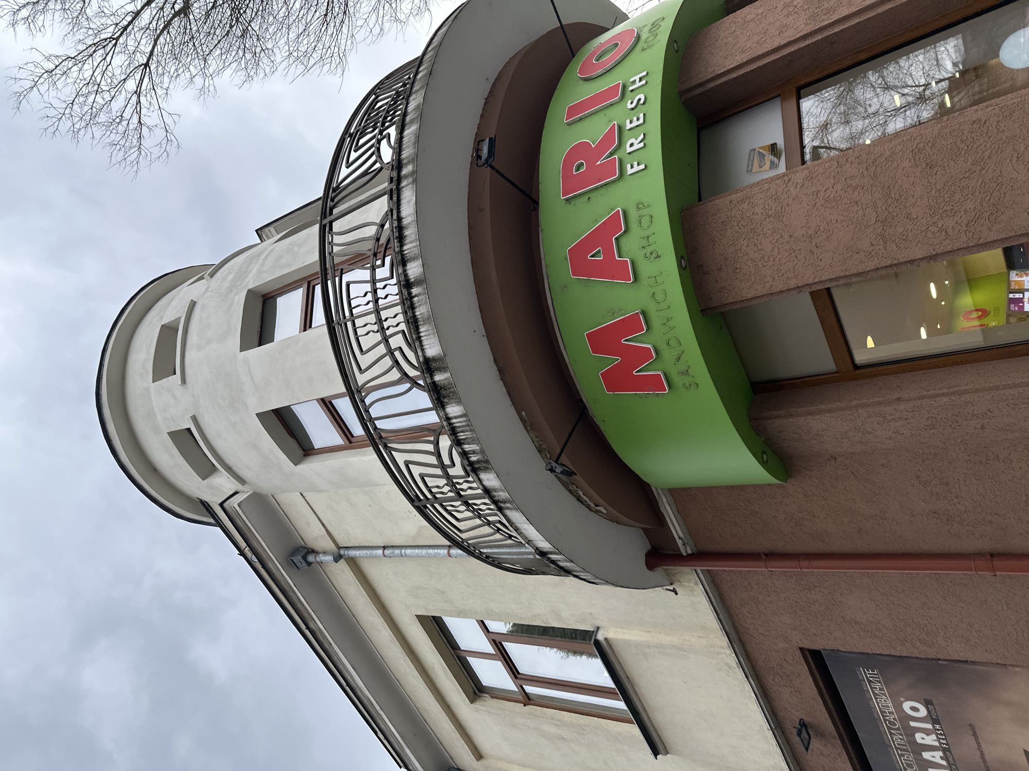 The image depicts the exterior of a building in Stara Zagora, Bulgaria, specifically the "Mario Fresh Food" sandwich shop. The building features a cylindrical tower-like structure with multiple windows and a decorative wrought iron balcony. The sandwich shop's sign is prominently displayed, featuring the name "MARIO" in red letters on a green background. The shop is located in a multi-story building with a brown facade. The sky is overcast. Bare tree branches are visible in the upper left corner of the frame.