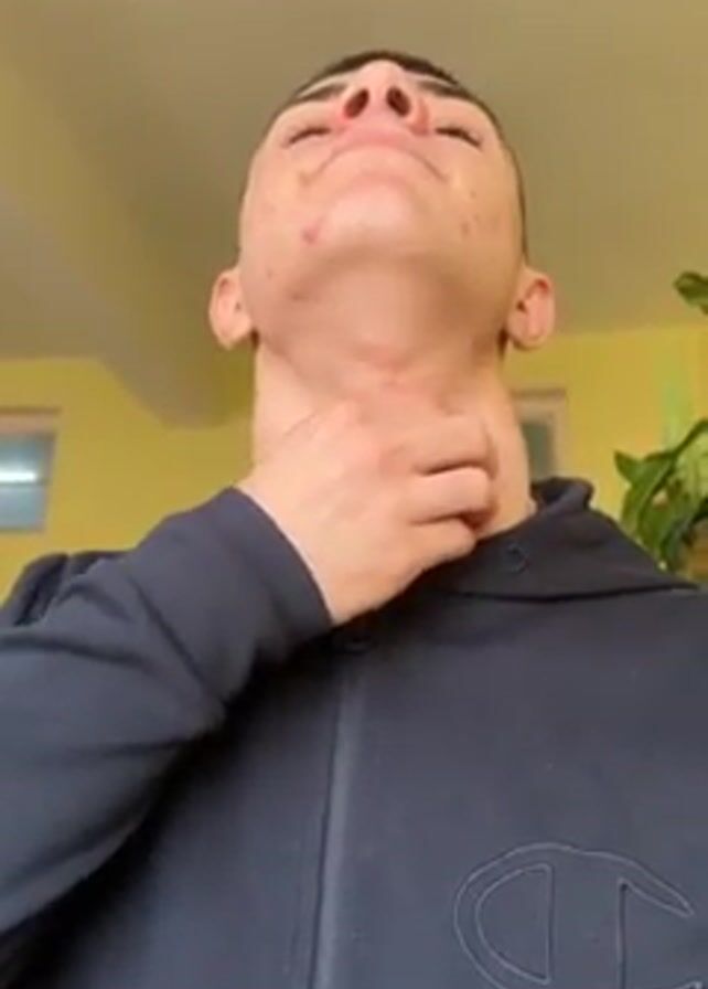 A low-angle shot shows a young man wearing a dark blue Champion zip-up jacket. He is looking upwards, his head tilted back, with a hand rubbing his neck. The man's face has acne. Behind him is a yellowish wall, a window, and the leaves of a green plant.