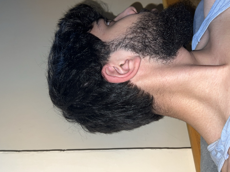 A man's head and upper chest are visible from a side angle. He has dark, thick hair, a full dark beard, and light skin. His head is tilted back, with his gaze directed upward. The ear is prominent. A light blue garment is visible at the edge of the frame. The background is a neutral off-white wall, with a hint of wooden furniture in the bottom right corner. The image is slightly blurry and rotated counter-clockwise.
