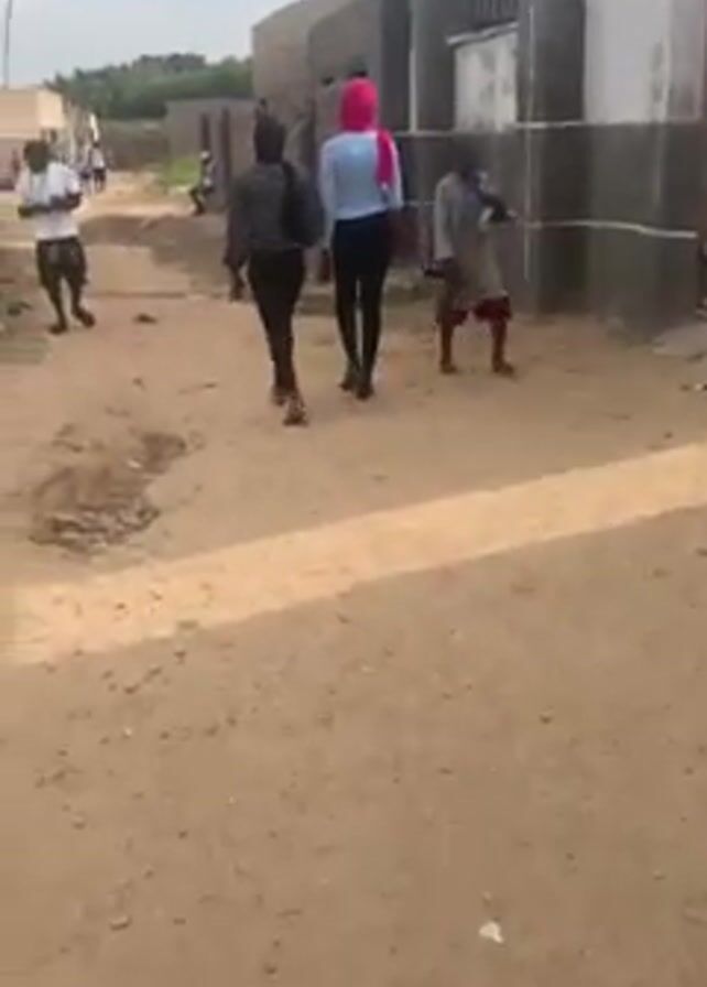 The camera follows two women walking away down a dirt road. They pass a man walking in the opposite direction, and a child in the distance. There are buildings on the right, and an open area on the left. The ground is dry and dusty.