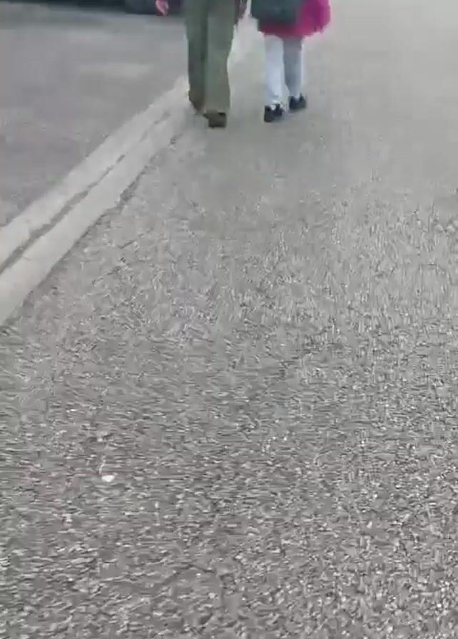 two children walking away from the camera on an asphalt road. They are both wearing backpacks and appear to be heading away from a car parked on the side of the road. The environment appears to be a residential street with houses and trees visible in the background.