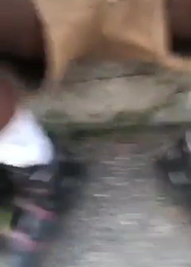 A person wearing a tan romper and white Nike socks with black strap shoes is standing on a cracked concrete surface with some grass and debris. They are holding a brown paper bag and a white bag with a black and white logo. The camera angle is close to the ground, pointing upwards. The person moves the bags around, showing them to the camera. Another person's legs and similar black strap shoes are briefly visible next to them.