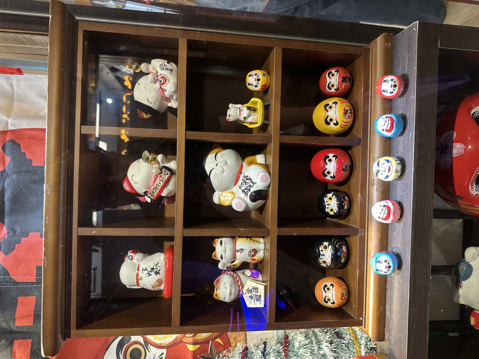 A dark wooden display cabinet, featuring nine glass-fronted compartments, is positioned within an establishment in the city of New Taipei, Taiwan. The cabinet, designed to showcase collectibles, holds a variety of Japanese-themed figurines. On the top shelf, from left to right: a white ceramic Maneki-neko (beckoning cat) on a red base with its left paw raised; a white Maneki-neko wearing a red hat, holding a golden ingot and a scroll; and a white Maneki-neko lying on its back with its left paw raised. The middle shelf, from left to right, contains: two smaller Maneki-neko figurines, one white and orange holding a charm, the other an orange tabby with its right paw raised; a larger white and orange Maneki-neko with its left paw raised; and two small figures—a white Maneki-neko on a yellow chair and a yellow floral Daruma doll. The bottom shelf displays five Daruma dolls: an orange one, two black ones with floral patterns, a red one, and a partially visible yellow one. Below the main cabinet, on a narrower dark wooden shelf, a row of five smaller, colorful Daruma-style dolls are arranged: two blue, one pink, one yellow, and one red, all depicted with smiling faces. The background behind the cabinet features a red and black patterned fabric and a miniature, decorated Christmas tree on the left. Reflections on the glass panels indicate an indoor setting and suggest the presence of an observer or photographer. A blue light emanates from the middle-left compartment. Partially visible below the lower shelf is a large red Daruma doll. No individuals are directly depicted, nor are specific actions or interactions visible within the frame.