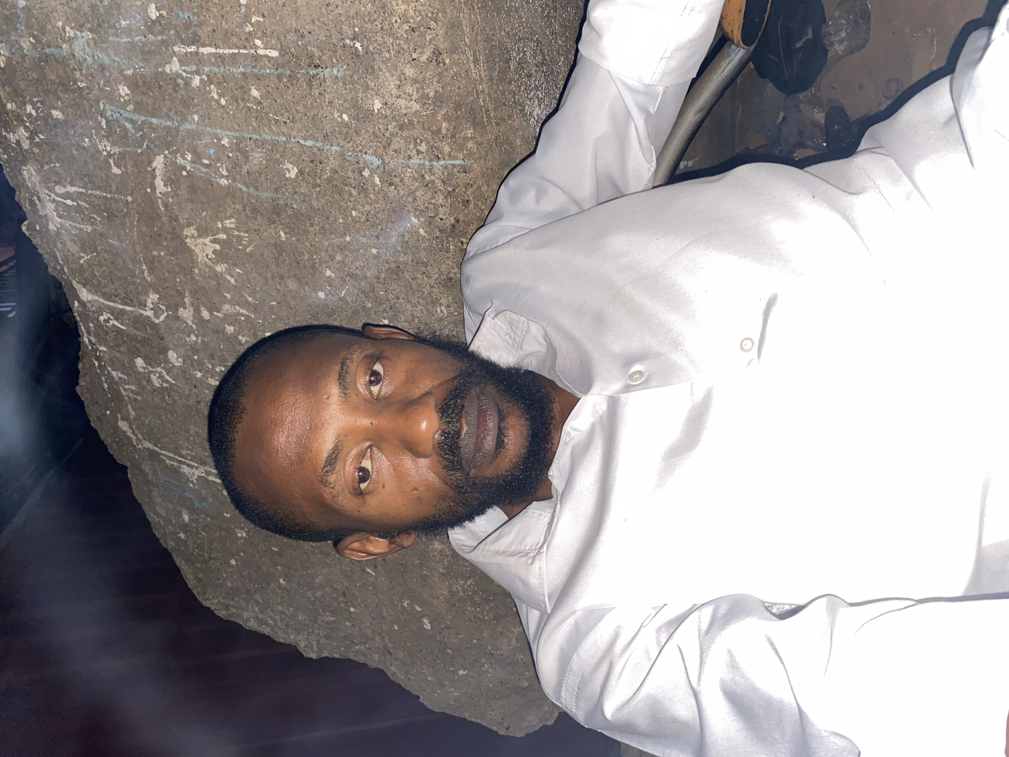 A medium shot presents a man with dark skin and a beard, wearing a white button-down shirt. He is positioned near a large, grey, rough-textured concrete structure that might be a wall or rock formation with paint splatters. Part of a metal object is visible in the background. The scene appears to be in a dimly lit outdoor setting, potentially in or around Narayi, Nigeria.