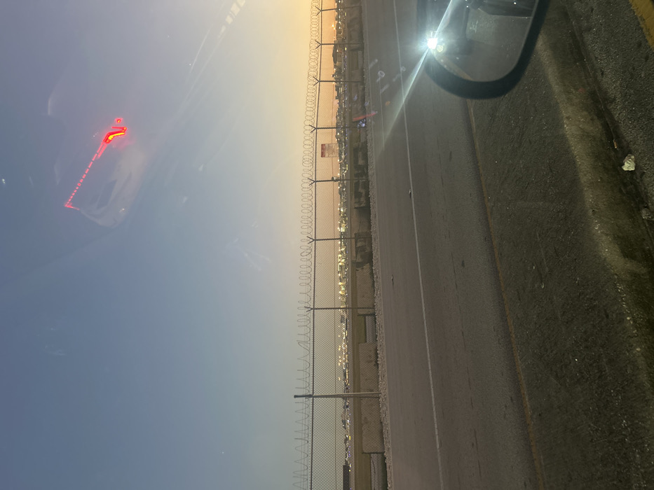 The image displays an exterior view of the perimeter of Miami International Airport in Miami, United States, captured during either dawn or dusk, evidenced by a gradient sky transitioning from light blue overhead to a pale orange-yellow near the horizon line. The scene is observed from inside a vehicle, with prominent reflections on the presumed windshield including a bright red angular light in the upper right quadrant and a strong white light, likely from a vehicle's headlamp or streetlamp, reflected in a partially visible side mirror in the lower right. In the foreground, a dark asphalt road surface with a faint white lane divider is visible, bordered by a concrete curb on the right. Small pieces of white debris are present on the ground near the curb. Stretching across the midground is a tall chain-link security fence, topped with multiple strands of barbed tape concertina wire. Behind this fence, a concrete barrier, possibly composed of large blocks or Jersey barriers, is visible, interspersed with scattered light-colored gravel or rocks. A red "DANGER" sign is affixed to the fence in the right-mid section. Beyond the fence and barrier, the background reveals an extensive airport tarmac or runway area, illuminated by numerous distant white, yellow, and red lights, indicative of airport infrastructure and active operations. No individuals or specific actions are discernible within the frame.