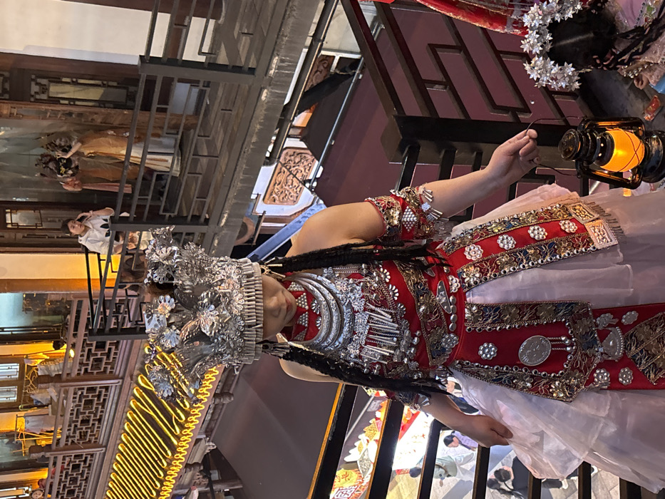 A female subject, likely young, stands in the foreground of a multi-level traditional Chinese architectural complex in 江北城街道, China, at night. She is adorned in elaborate red and silver traditional attire, including a large, ornate silver crown-like headpiece, multi-layered silver necklaces, a heavily embroidered red upper garment with silver armbands, and a white, ruffled skirt. Her dark hair is styled in two long braids. She looks downwards, holding a black lantern with an orange glowing light in her right hand. Behind her, on an elevated walkway with a dark geometric railing, a female in a white hoodie uses a mobile phone, while two other individuals or mannequins in traditional gold costumes with elaborate headwear are visible through a glass barrier in a brightly lit room. The environment features traditional wooden architecture with intricate carvings, illuminated by warm yellow and orange artificial lighting, indicating an evening or nighttime setting. Below the main subject, blurred figures and further architectural details are visible on lower levels.