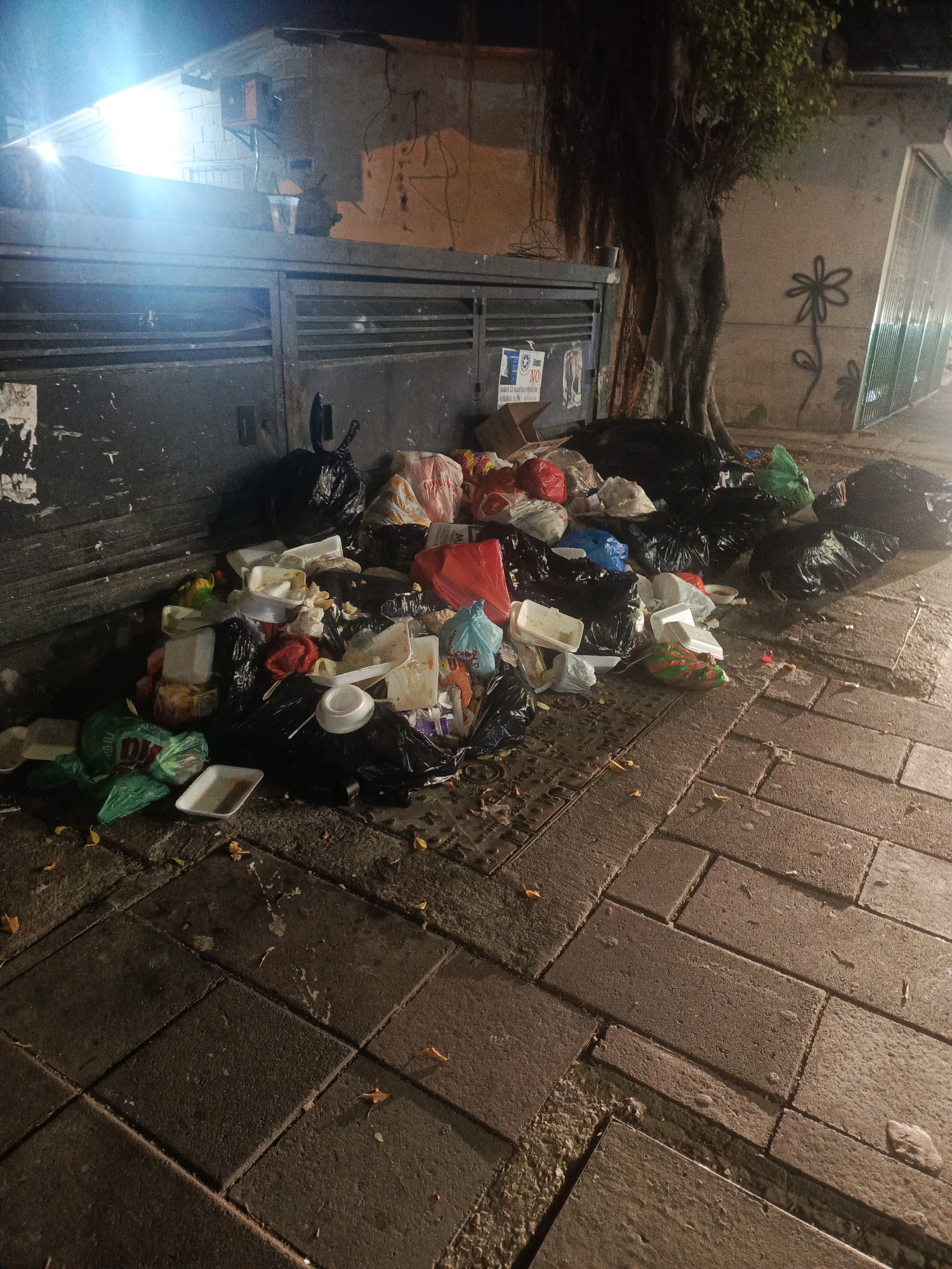 large pile of garbage bags and loose trash, including black plastic bags, styrofoam containers, and other discarded items, overflowing onto a brick sidewalk in what appears to be a street scene. The garbage is piled against a dark, metal gate or barrier. A tree is located adjacent to the garbage pile, with its roots visible near the wall. Graffiti, resembling a flower, is visible on the wall behind the tree. The setting appears to be at night, with lighting illuminating the garbage and surrounding area. The photograph was taken in Guayaquil, Ecuador.