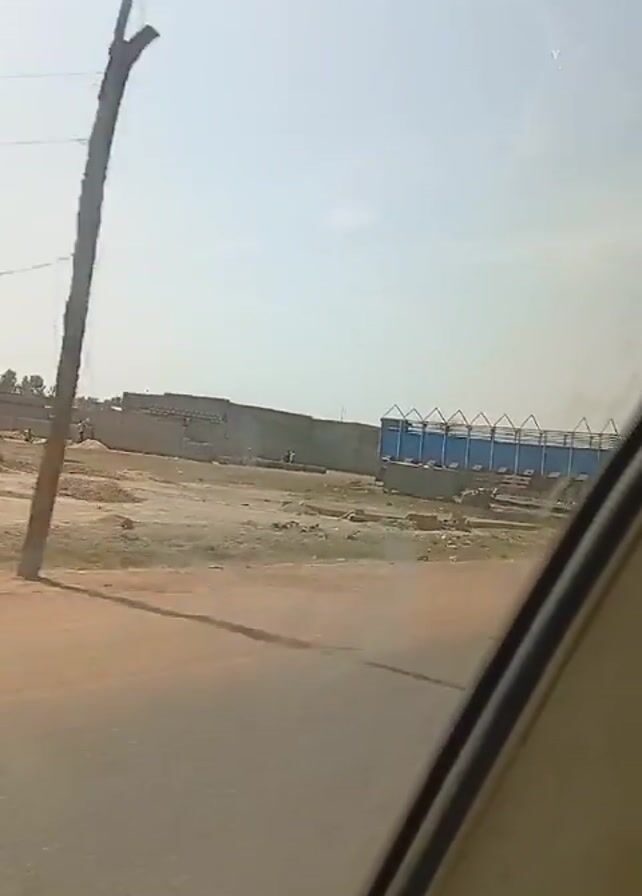 The video is taken from inside a moving vehicle traveling on a paved road. The landscape seen through the window appears to be a developing or industrial area with a mix of construction sites, buildings in various states of completion, and open land. Objects such as building materials, a large truck trailer, and small structures are visible. There are a few people observed moving around the area, including one individual walking along the side of the road. The sky is light blue with a slight haze, suggesting a clear but possibly dusty day. The overall impression is of a somewhat arid environment.