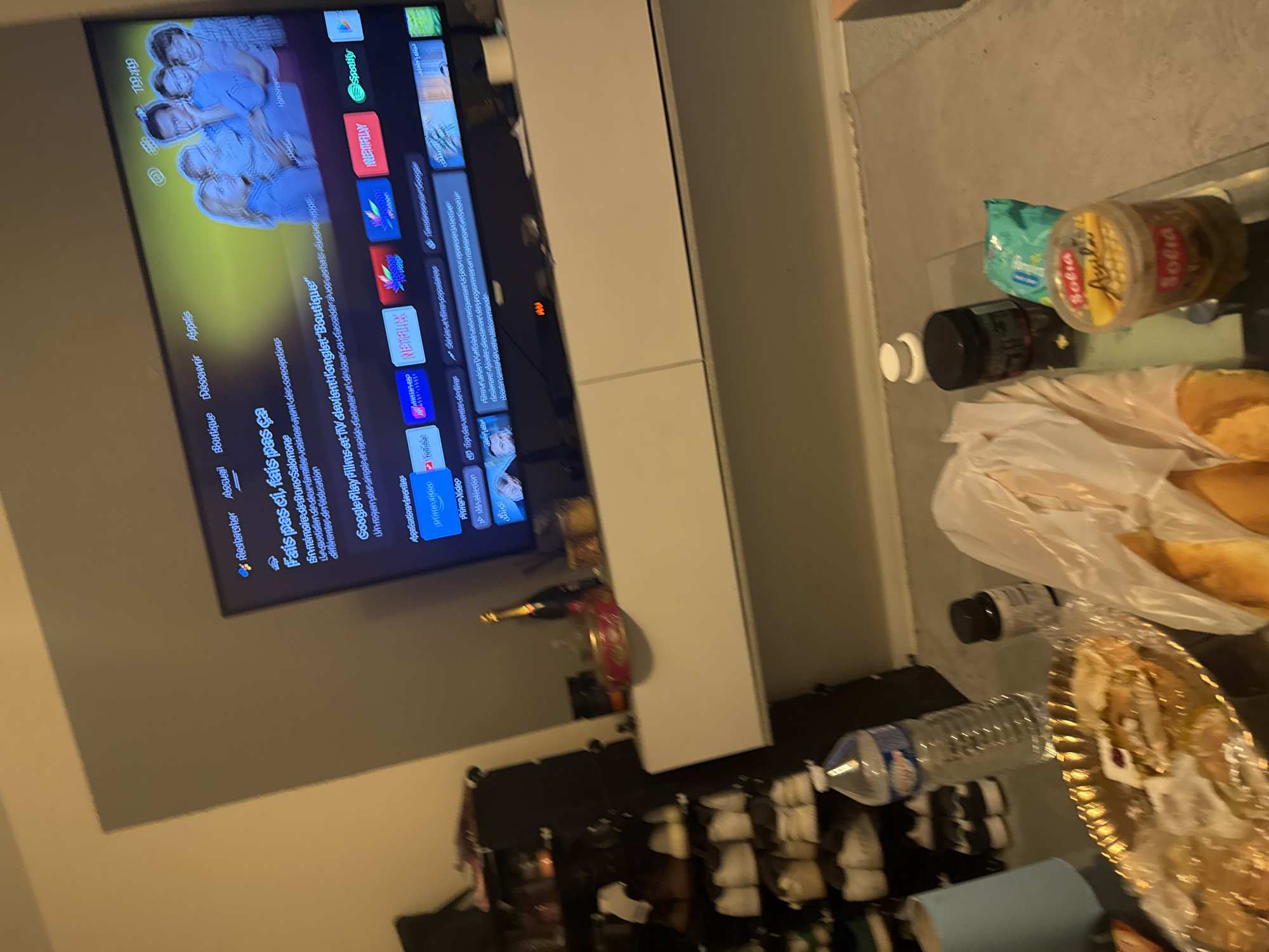 This image depicts an indoor domestic setting, located in the city of Unknown, Unknown. A large, dark-bezeled flat-screen television is centrally mounted on a white, two-compartment floating media console against a light gray wall. The television screen displays a French-language smart TV interface, featuring a banner for the series "Fais pas ci, fais pas ça" with a family of five. Text below this banner indicates "En mémoire de Bruno Salomone" and "Google Play Films et TV devient l'onglet 'Boutique'." Favorite application icons are visible for Prime Video, Netflix, YouTube, Canal+, Disney+, MyCanal, OCS, and Spotify. To the left of the console, a dark, multi-tiered shoe rack is filled with numerous pairs of shoes, predominantly sneakers. On the media console to the left of the TV, a dark bottle, a red decorative tin, and smaller indeterminate objects are positioned. The foreground features a glass-top table holding various items: a golden fluted serving tray covered in plastic wrap containing partially consumed pastries with flaky crusts and red filling, a clear plastic bottle of "Cristaline" branded water, a small black cylindrical bottle, a clear plastic bag containing two baguette-style loaves of bread, a black container with a white lid, a small teal-colored packet, and two clear plastic containers with yellow lids, labeled "Sofia," with the top one specifically identifying "Ajvar." The ambient lighting is dim. No individuals are visible in the scene.