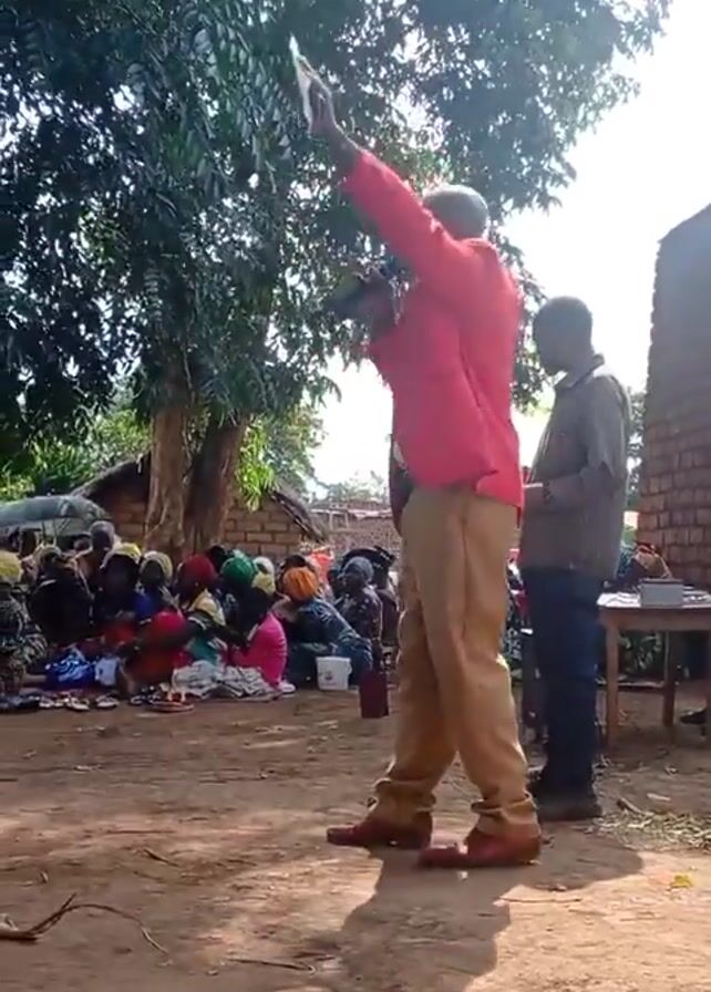 n outdoor gathering of people, likely in a rural area. In the foreground, a man wearing a red jacket, khaki pants, and brown shoes stands and gestures with a white object in his raised hand. Another man stands beside him, holding what appears to be a notebook. A group of women is seated on the ground, facing the standing man, some with small buckets or containers in front of them. A tree provides shade for the group. In the background, there is a brick building and a distant view of a landscape with hills or mountains. The ground appears to be dirt or packed earth.