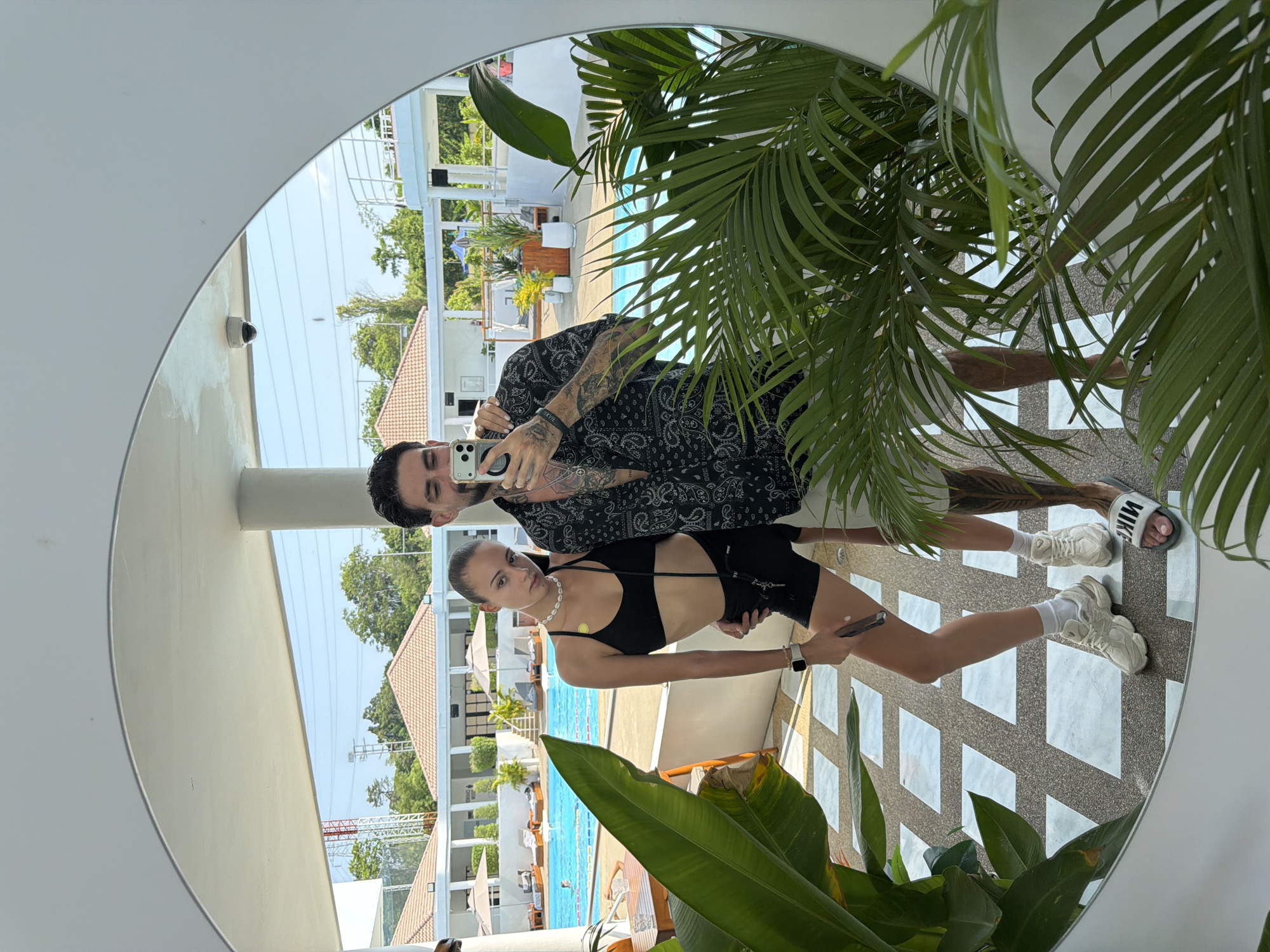 A mirror selfie captures two individuals posing outdoors at the Grand Mercure Phuket Patong resort in Kathu, Thailand. In the foreground, reflected in a large, round white-framed mirror, are a female and a male. The female, appearing in her 20s with dark hair pulled back, wears a black sports bra, black shorts, white sneakers, and white socks. She has a white beaded necklace and a white Apple Watch on her left wrist. Her right hand holds a dark smartphone, pointed downwards, while her left arm is wrapped around the male's waist. A small yellow circular patch is visible on her upper chest. The male, also appearing in his 20s or 30s with dark hair, beard, and mustache, wears an open black short-sleeved shirt with a white paisley pattern, revealing a dark necklace and extensive tattoos on his arms and chest. He wears white shorts and black "NIKE" branded slide sandals. He holds a silver-colored smartphone, used to capture the mirror reflection, partially obscuring his face. His left arm is around the female's upper back. The background, visible around the reflections, reveals an outdoor resort setting under a clear blue sky. A large light-blue swimming pool occupies the mid-ground, featuring lane markers and surrounded by sun loungers and umbrellas. Behind the pool, white buildings with red-orange tiled roofs are visible, consistent with hotel or resort architecture. A sign partially reads "GRAND M". Lush green tropical plants, including palm fronds and broad-leafed plants, are prominent in the immediate foreground, partially framing the reflection. A white concrete ceiling structure with a mounted white dome security camera is visible above the individuals. In the far distance, a red and white communication tower stands against the sky, along with further green trees and vegetation. The ground in the foreground is patterned with white and dark square/rectangular tiles.