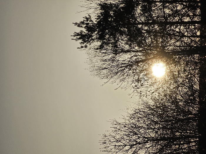 This image displays a natural outdoor scene in Marche-en-Famenne, Belgium, characterized by intense backlighting. The sun, appearing as a bright white-yellow orb with lens flare, is positioned in the mid-left portion of the frame, partially obscured by the upper branches of several trees. These trees, predominantly deciduous with bare or sparsely leafed branches, form a dense, dark silhouette across the lower two-thirds of the image. At least one coniferous tree, distinguished by its denser, darker foliage, is visible on the right side. The sky above occupies the upper third of the frame, exhibiting a uniform light beige-grey tone. No individuals, animals, man-made structures, or explicit actions are present within the scene. The lighting conditions suggest either sunrise or sunset over a wooded area.