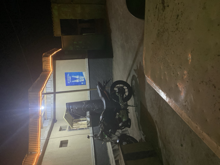 A low-angle outdoor shot at night features a two-story building illuminated with lights along the roofline. A poster hangs on the side, and a motorcycle is parked in front. The building's architecture includes windows and a balcony. A dark sky is visible above the building. The foreground is a wall, lit by an external light source, casting a shadow of the motorcycle. The photo is slightly rotated.