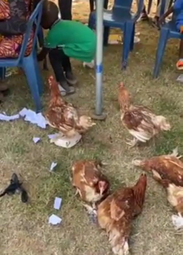 gathering of children near a collection of chickens on a grassy surface. Most of the chickens are brown and white, and some appear to be lying down or incapacitated. A child wearing a green shirt is seen interacting with one of the chickens, while other children sit on blue plastic chairs nearby, observing the scene. There is a tent pole nearby, and scraps of white paper are scattered on the ground.