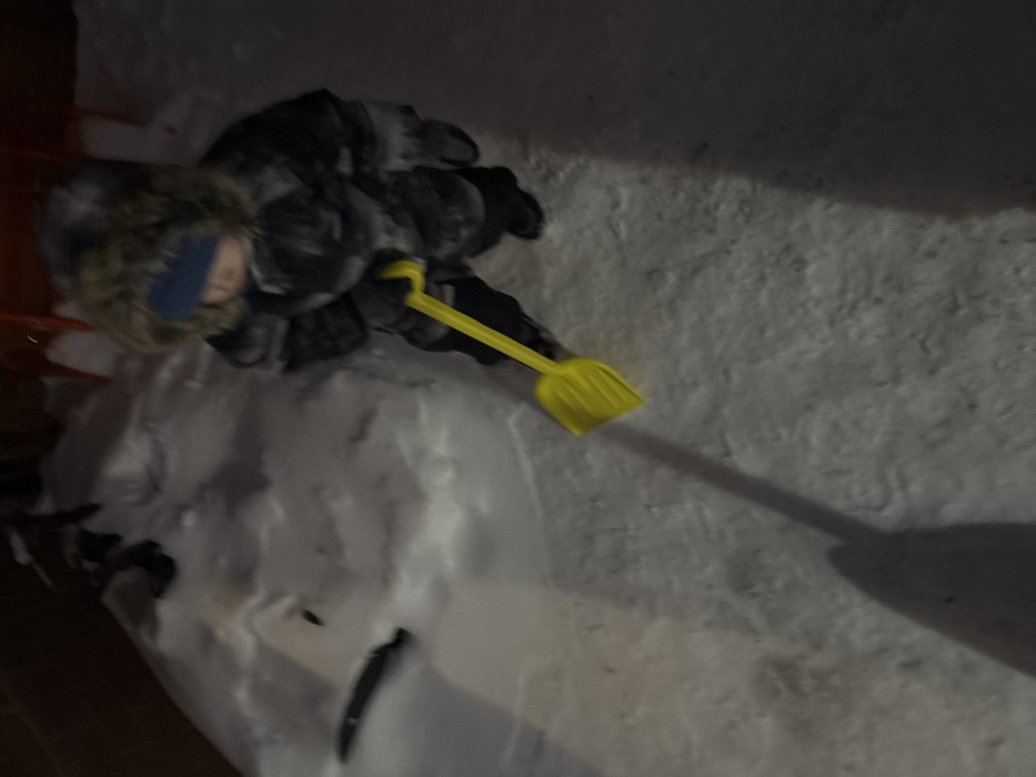 The image depicts a nighttime or low-light outdoor scene in Ферма, Russia, covered in snow. A young child, dressed in a dark, patterned winter jumpsuit with a fur-lined hood and dark gloves, holds a bright yellow plastic shovel in their right hand, extending it towards the snow-covered ground. A blue knit hat or head covering is visible on the child's head, obscuring the upper face. To the left of the child, a partially constructed snowman or snow mound is visible, featuring a dark horizontal element embedded within it. The ground is unevenly covered with fresh snow, showing disturbed areas and footprints. A long shadow cast by the child and shovel stretches across the snow in the foreground. Dimly lit dark objects and a red structure are present in the blurred background.