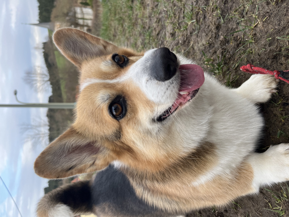 - "A tri-color Pembroke Welsh Corgi is depicted standing outdoors on muddy ground with sparse green vegetation, facing forward and slightly to the right" by FM-4GKkh1, licensed under CC BY 4.0