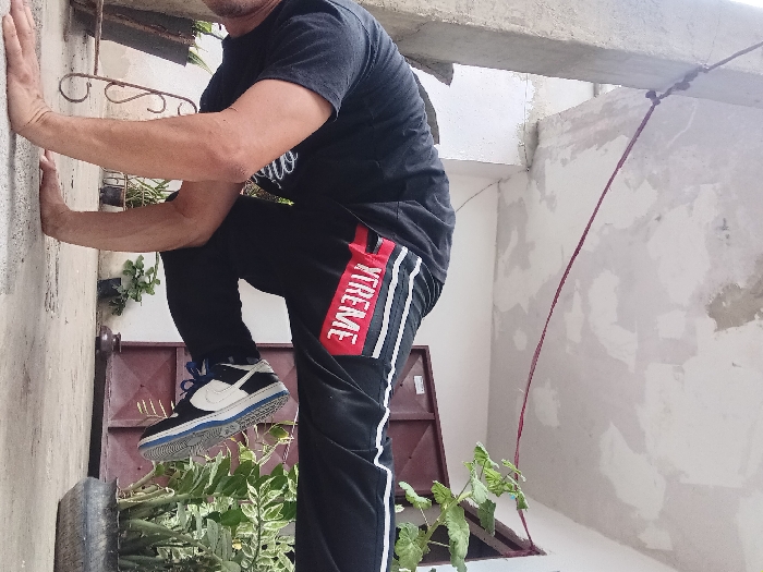 An adult male is observed performing a calisthenics or acrobatic pose in an outdoor, semi-enclosed concrete area within the city of Duaca, Venezuela