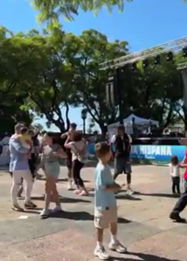 crowd of people in an outdoor square on a sunny day. There are some people dancing while others are walking by. A stage with lighting is set up in the background. Green trees provide shade over the square. There is a banner with text that appears to read “ALMA HISPANA.” Some of the people are interacting, like adults holding hands with children.