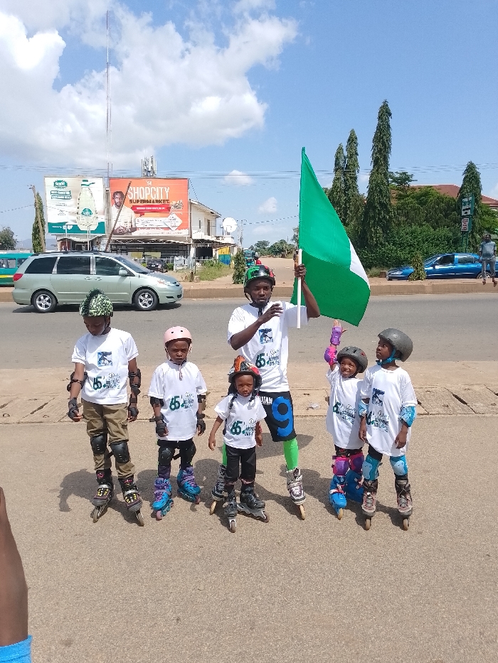 A group of six individuals, comprising one adult male and five children, stands on rollerblades on an asphalt surface under a clear sky with scattered white clouds. All six are wearing white t-shirts emblazoned with a graphic and the text "65 JOS ROLLER SPORTS," along with helmets, knee pads, elbow pads, and wrist guards. The adult male, positioned centrally, holds a Nigerian flag (green, white, green) vertically on a white pole. He wears black shorts with a white number "9" and bright green leggings. The five children, varying in apparent age, are positioned around him, generally facing the camera. One child on the far right raises their right arm. In the background, a light-colored minivan and a blue sedan are visible on a multi-lane road. Commercial buildings line the street, featuring prominent billboards. One billboard advertises "SHOPCITY SUPERMARKET" with a male figure, while another promotes "SCOTT'S" products with a cow motif. Tall, coniferous trees are visible on the right side of the background. The scene is located at the Terminus Roundabout in Jos, Nigeria, identifiable by the specific "SHOPCITY SUPERMARKET" billboard.