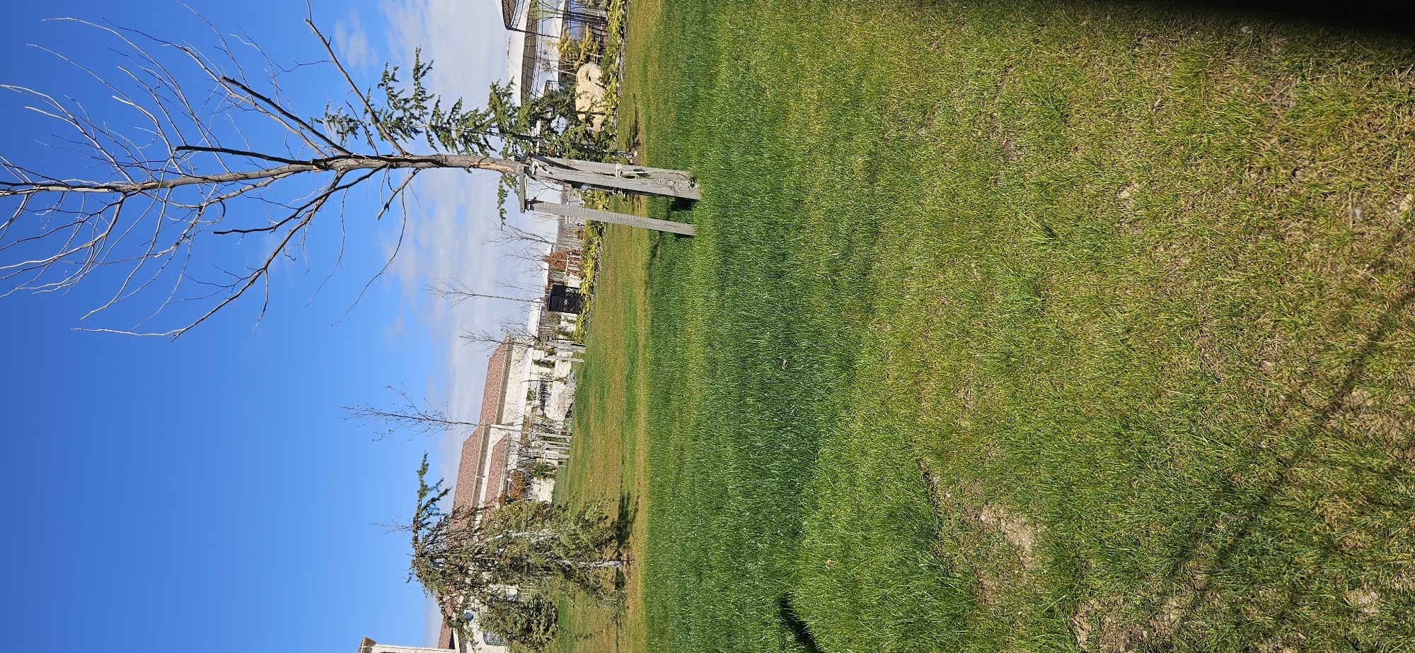 The image depicts an outdoor scene, potentially a landscaped area, likely located in Kocherinovo, Bulgaria. The foreground is dominated by a verdant expanse of grass transitioning in color and possibly density toward the bottom right corner of the frame. Several trees are visible, one of which appears to be supported by wooden braces. The sky is a clear blue, with sparse clouds visible near the horizon. A building with a red tile roof is present in the middle ground. Other buildings and structures can be seen in the background. The image appears to have been taken during daylight hours with clear weather conditions.