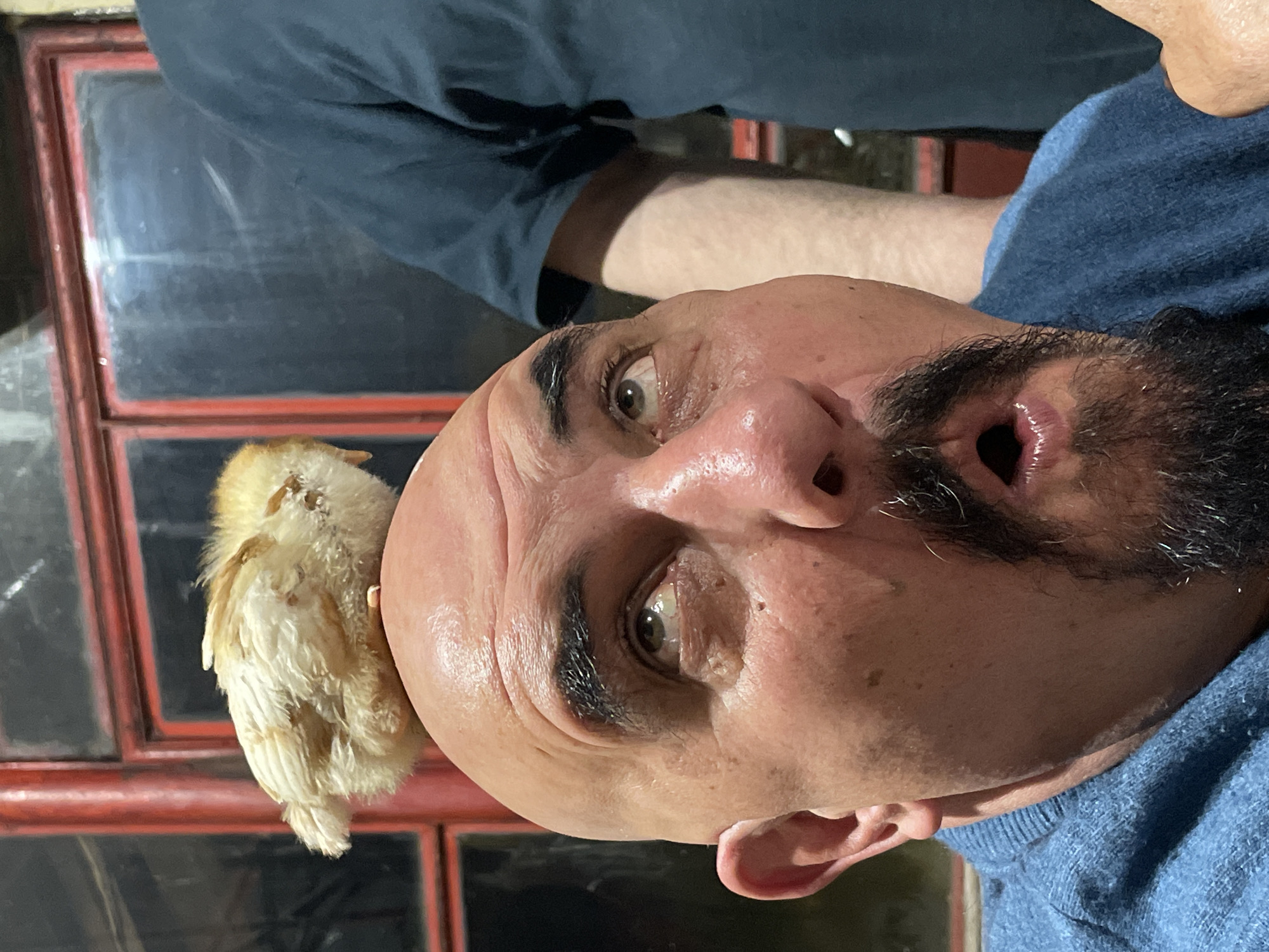 - "A photograph shows a bald man with a beard and a small yellow chick perched on his head" by FM-IUG5C3, licensed under CC BY 4.0