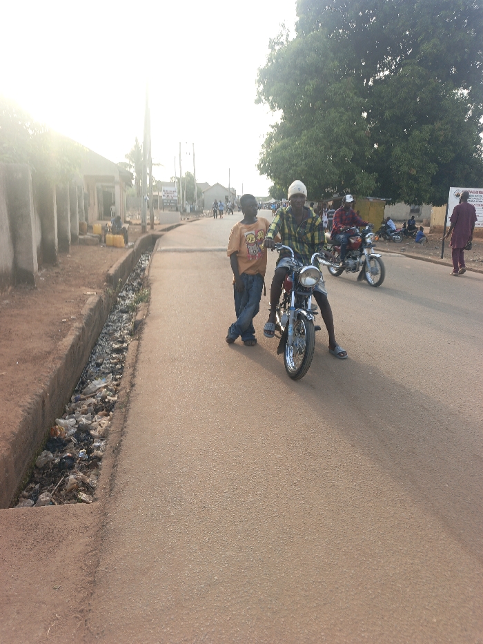 The image presents a street scene in Akwanga, Nigeria, under bright sunlight, likely late afternoon, casting distinct shadows. The central feature is a paved, reddish-brown asphalt road. To the left, a concrete drainage ditch runs parallel, filled with visible refuse including plastic containers and other debris. Beyond the ditch, a dirt verge is present, followed by a series of concrete pillars and low wall sections, then single-story structures. Several yellow jerry cans are visible near one of these structures on the left. In the foreground, two males are positioned with a red motorcycle. One male, wearing a white beanie, a yellow and black plaid long-sleeved shirt, and sandals, is seated on the red motorcycle, with both feet on the ground. To his left, a younger male, dressed in an orange t-shirt and blue jeans, stands with his left foot crossed over his right. The motorcycle features chrome handlebars and a prominent silver front wheel. Further down the road, in the mid-ground, another red motorcycle is visible, operated by an individual in a red long-sleeved shirt. On the right side of the road, a dirt verge hosts a large tree under which a group of individuals are seated. A person in a maroon garment walks away from the camera on this verge. Utility poles with electrical wiring are distributed along the street. The background shows additional residential or commercial buildings and pedestrians along the roadway. The sky is bright and clear.