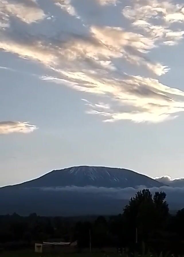 The video depicts a scenic view of a mountain range, possibly Mount Kilimanjaro, silhouetted against a partly cloudy sky at dusk or dawn. The sky is a pale blue with wispy clouds tinged with golden light. In the foreground, there's a dark line of trees and vegetation, hinting at a forest or fields below. The camera pans upwards, revealing more of the sky and clouds.