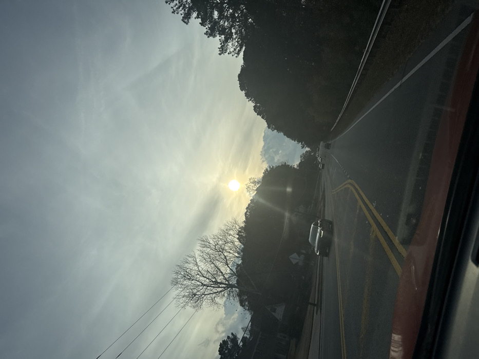 The photograph captures a view from a vehicle, looking down a sunlit road. The road has double yellow lines and cars are present. Trees line both sides, casting shadows. The sun, low in the sky, creates a glare. Power lines run parallel to the road on the left. The sky is mostly cloudy with some clear patches. The image is slightly rotated.