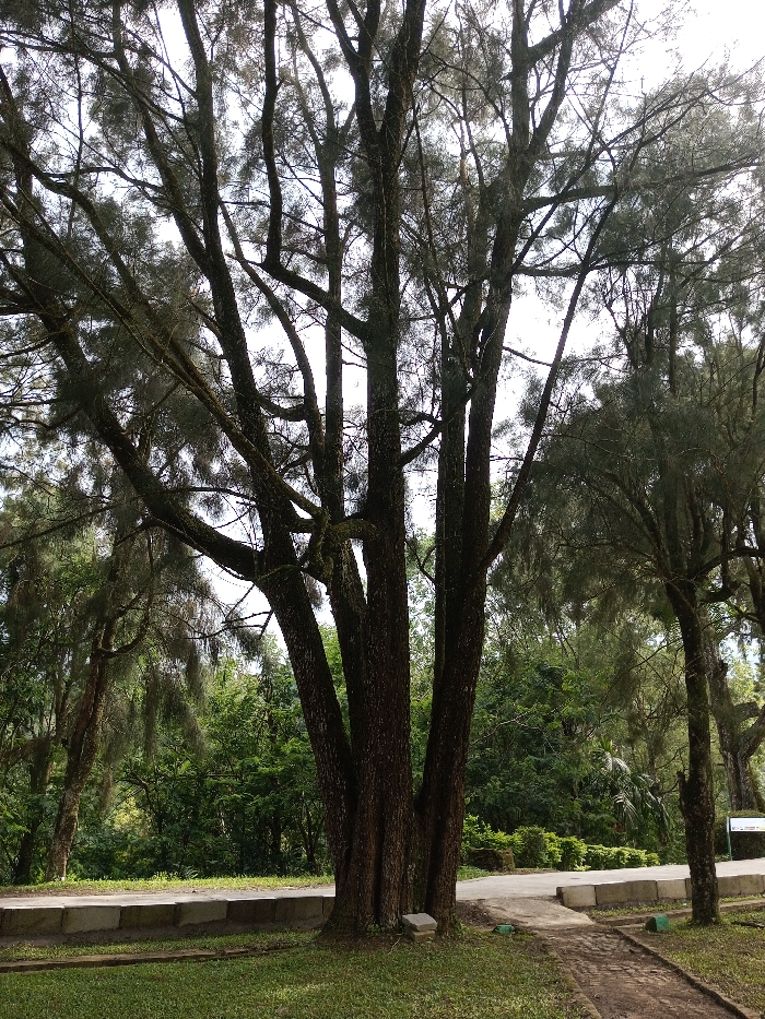 This image displays a park-like outdoor scene in New Serchhip, India. A large, multi-trunked tree with dark, textured bark and dense, dark green needle-like foliage stands prominently in the foreground, slightly left of center. Its branches extend upwards against a bright, overcast sky. At ground level, a section of mown green grass occupies the lower left and extends toward the tree's base. A light-colored pedestrian path, appearing to be concrete, originates from the lower right and curves leftward past the central tree. Small, low-lying green markers are visible along the edge of this path near the tree. Behind the path, a raised concrete curb borders a paved road that curves gently to the right. The midground and background feature additional similar trees with visible branches and dense green undergrowth, indicating a heavily vegetated area. No individuals, animals, or vehicles are present. The scene is illuminated by natural, diffused daylight.